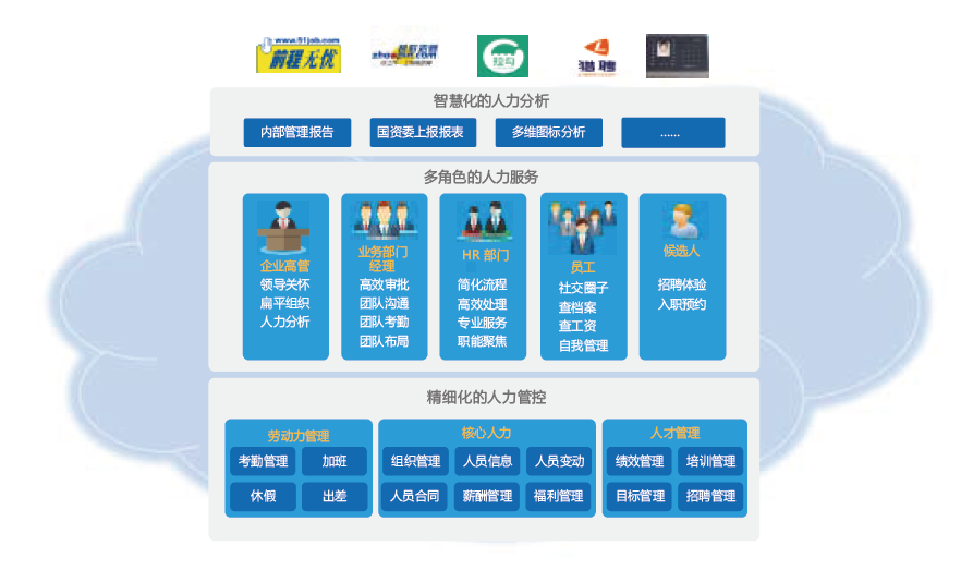 人力云是基于“互联网 +”的人力资源服务平台,开创性的采用 “私有云 + 公有云” 的混合云架构,链接管控 + 服务的双核心,拥有稳定的核心系统、便捷的互联网模式以及人性化的服务。 一方面聚焦“标准、流程、管控”,实现人才的“选、育、用、留”的全生命周期管理,提供包括组织管理、人事管理、薪酬管理在内的核心人事应用,另一方面,连接 HR 专员、高管、部门经理、员工、 候选人,面向不同层级、不同角色,提供不同的人力资源服务。支撑企业从“选、育、用、留”模式到“三支柱”转型。